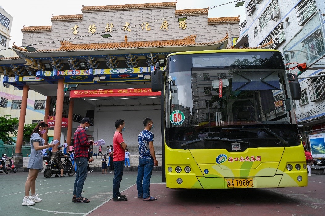 Villagers line up to get COVID-19 vaccines in front of a mobile vaccination vehicle in Haikou, south China's Hainan province, April 7. (Photo by Shi Zhonghua/People's Daily Online)