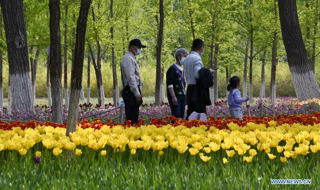 Citizens enjoy the scenery of blooming flowers by Yongding River in Daxing District of Beijing, capital of China, April 24, 2021. (Xinhua/Li Xin)