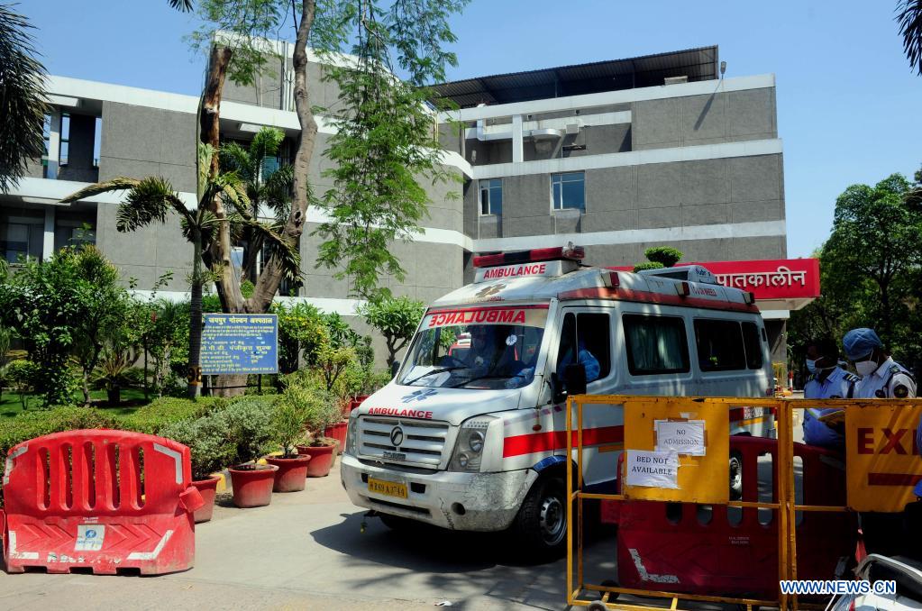 An ambulance is seen at Jaipur Golden Hospital in New Delhi, India, April 24, 2021. According to the health ministry, India witnessed historical high figures both in daily confirmed COVID-19 cases and new deaths on Saturday, as 346,786 more infections and 2,624 deaths were reported. The total tally has reached 16,610,481 and the death toll increased to 189,544 in the country. (Str/Xinhua)