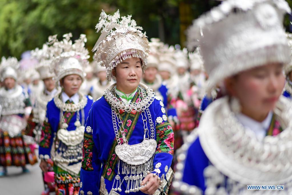 People of Miao ethnic group attend a parade to celebrate the Miao Sisters Festival in Taijiang County, Qiandongnan Miao and Dong Autonomous Prefecture, southwest China's Guizhou Province, April 25, 2021. Recognized as a national intangible cultural heritage, the Miao Sisters Festival is celebrated annually around the 15th day of the third lunar month according to the lunar calendar in China. (Xinhua/Tao Liang)