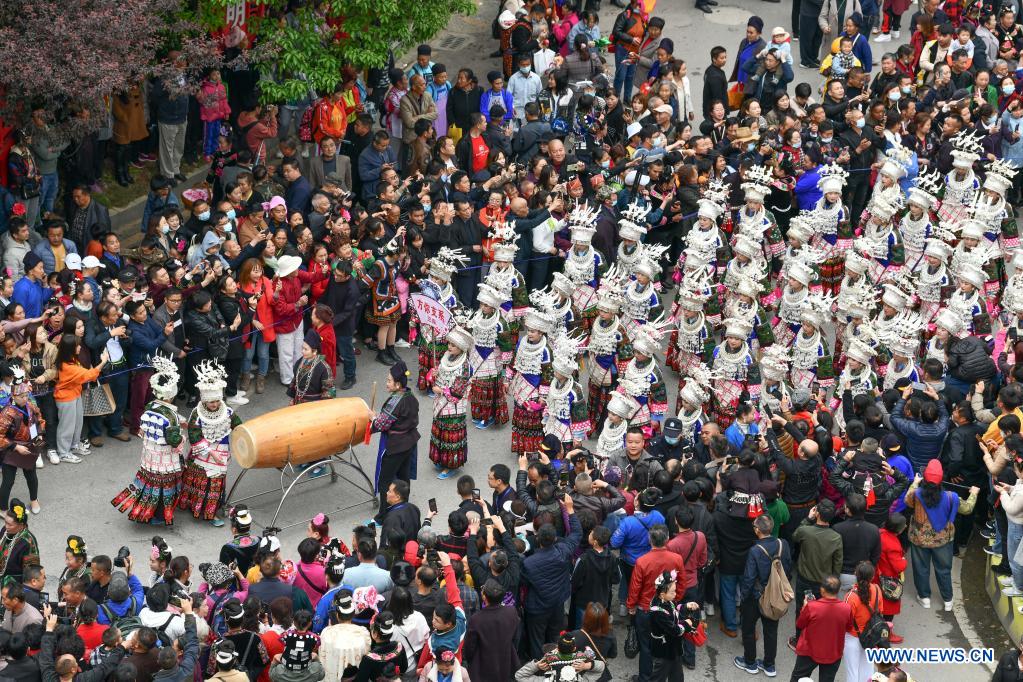 People of Miao ethnic group attend a parade to celebrate the Miao Sisters Festival in Taijiang County, Qiandongnan Miao and Dong Autonomous Prefecture, southwest China's Guizhou Province, April 25, 2021. Recognized as a national intangible cultural heritage, the Miao Sisters Festival is celebrated annually around the 15th day of the third lunar month according to the lunar calendar in China. (Xinhua/Yang Wenbin)