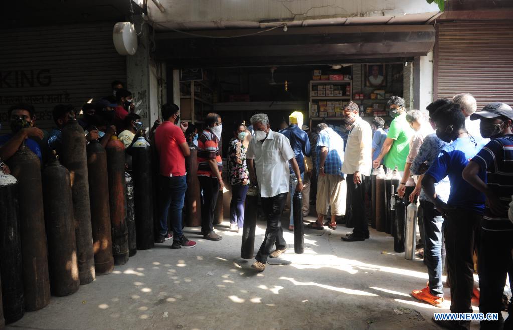 People wait in line to refill empty medical oxygen cylinders for COVID-19 patients in front of a shop in New Delhi, India, April 26, 2021. (Xinhua/Partha Sarkar)
