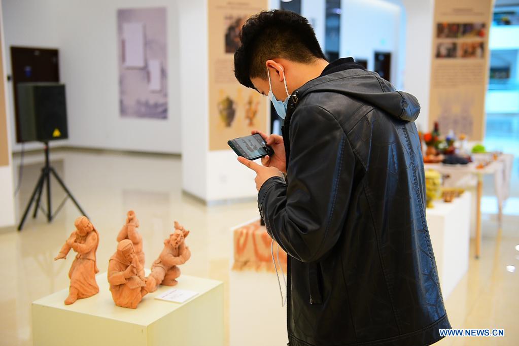 A visitor takes photos of exhibits at an exhibition of traditional crafts with Xinjiang characteristics in Urumqi, northwest China's Xinjiang Uygur Autonomous Region, April 26, 2021. (Xinhua/Hou Zhaokang)