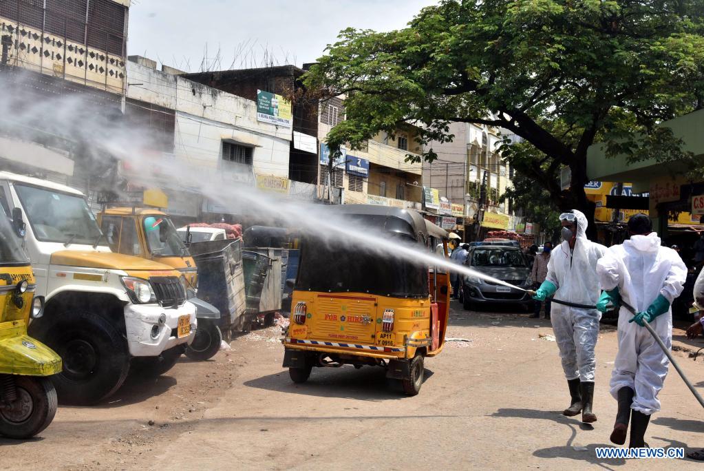 Personnel from Disaster Response Force (DRF) sanitize shops at the Mahbub mansion area, one of the biggest wholesale markets in Hyderabad, capital of India's southern state of Telangana, on April 26, 2021. India has, in the past days, witnessed a resurgence of COVID-19 cases, overwhelming the populous country's already crumbled healthcare system. (Str/Xinhua)