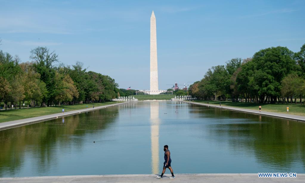 A man walks past the Lincoln Memorial Reflecting Pool in Washington, D.C., the United States, on April 27, 2021. The U.S. Centers for Disease Control and Prevention (CDC) unveiled new guidelines for fully vaccinated Americans on Tuesday, including activities they can safely resume without wearing masks. (Xinhua/Liu Jie)