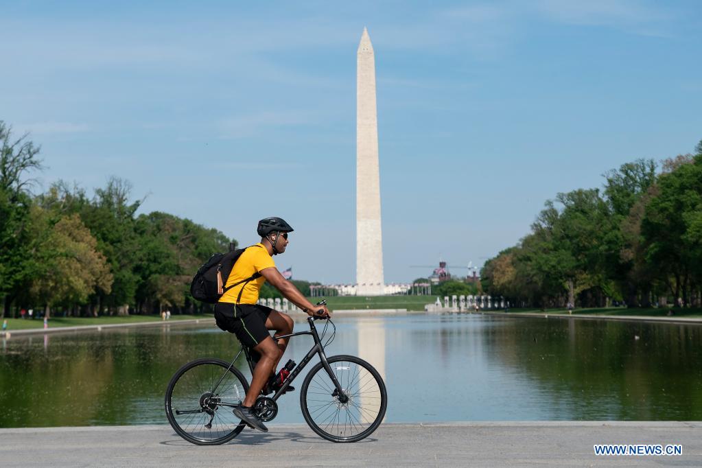 A man rides a bicycle past the Lincoln Memorial Reflecting Pool in Washington, D.C., the United States, on April 27, 2021. The U.S. Centers for Disease Control and Prevention (CDC) unveiled new guidelines for fully vaccinated Americans on Tuesday, including activities they can safely resume without wearing masks. (Xinhua/Liu Jie)