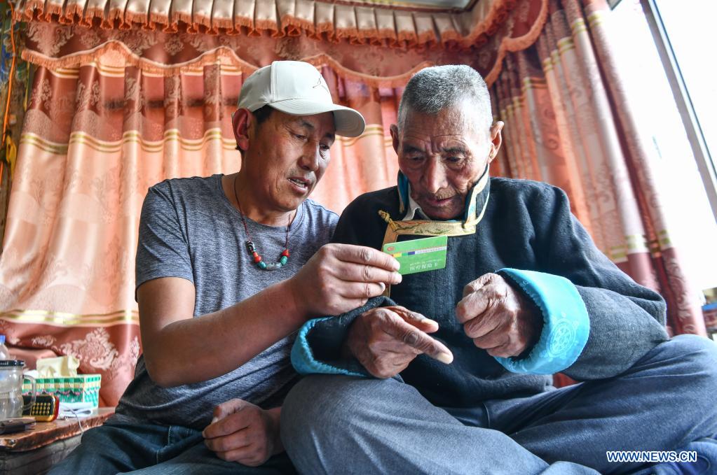 Lhapu (R) listens to his son's explanation to the medical insurance card at Lin'a Village of Dagze County in Lhasa, southwest China's Tibet Autonomous Region, April 25, 2021. Lhapu, born in 1938, worked as a serf before the democratic reform in Tibet in 1959, which abolished its feudal serfdom under theocracy. "As part of the production tools, we just did what the lord asked us to do, and were even forbidden to speak loudly," Lhapu recalled his life in the old times, adding that children had no guaranteed food and clothing. After the democratic reform, great changes have taken place in Lhapu"s life. He received some land and built a new house. Now the 83-year-old enjoys a happy life with his children and grandchildren. (Xinhua/Jigme Dorje)