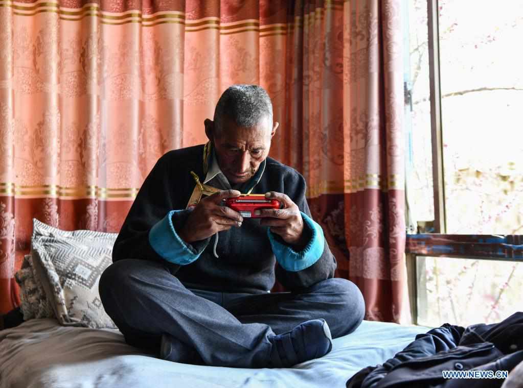 Lhapu listens to the radio at home at Lin'a Village of Dagze County in Lhasa, southwest China's Tibet Autonomous Region, April 25, 2021. Lhapu, born in 1938, worked as a serf before the democratic reform in Tibet in 1959, which abolished its feudal serfdom under theocracy. "As part of the production tools, we just did what the lord asked us to do, and were even forbidden to speak loudly," Lhapu recalled his life in the old times, adding that children had no guaranteed food and clothing. After the democratic reform, great changes have taken place in Lhapu"s life. He received some land and built a new house. Now the 83-year-old enjoys a happy life with his children and grandchildren. (Xinhua/Jigme Dorje)