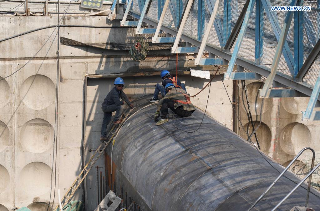Workers are busy at the construction site of the Baihetan hydropower station in southwest China, April 27, 2021. Construction of the Baihetan hydropower station in southwest China is proceeding smoothly. With a total of 16 homegrown million-kilowatt generating units, Baihetan hydropower station, located on the Jinsha River, the upper section of the Yangtze, straddling Yunnan and Sichuan provinces, is the second-largest in China after the Three Gorges Dam project in the central province of Hubei in terms of installed capacity. (Photo by Liang Zhiqiang/Xinhua)