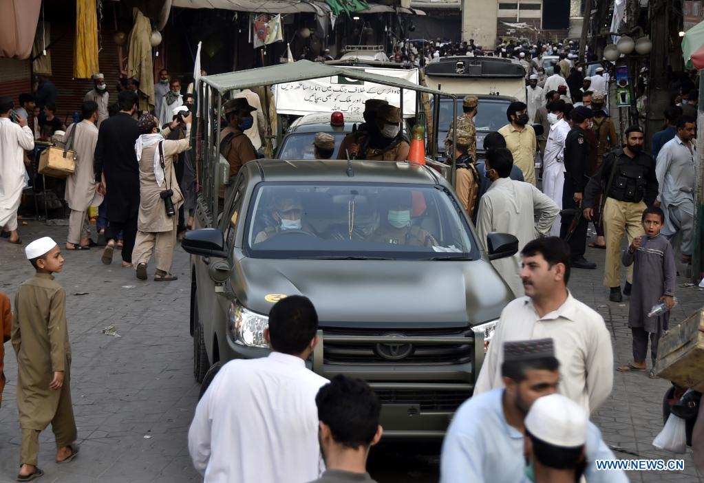 Pakistani soldiers patrol in a market in northwest Pakistan's Peshawar on April 28, 2021. Troops from the Pakistani army have been deployed in 16 cities of the country to ensure compliance with COVID-19 guidelines by the public. (Photo by Saeed Ahmad/Xinhua)