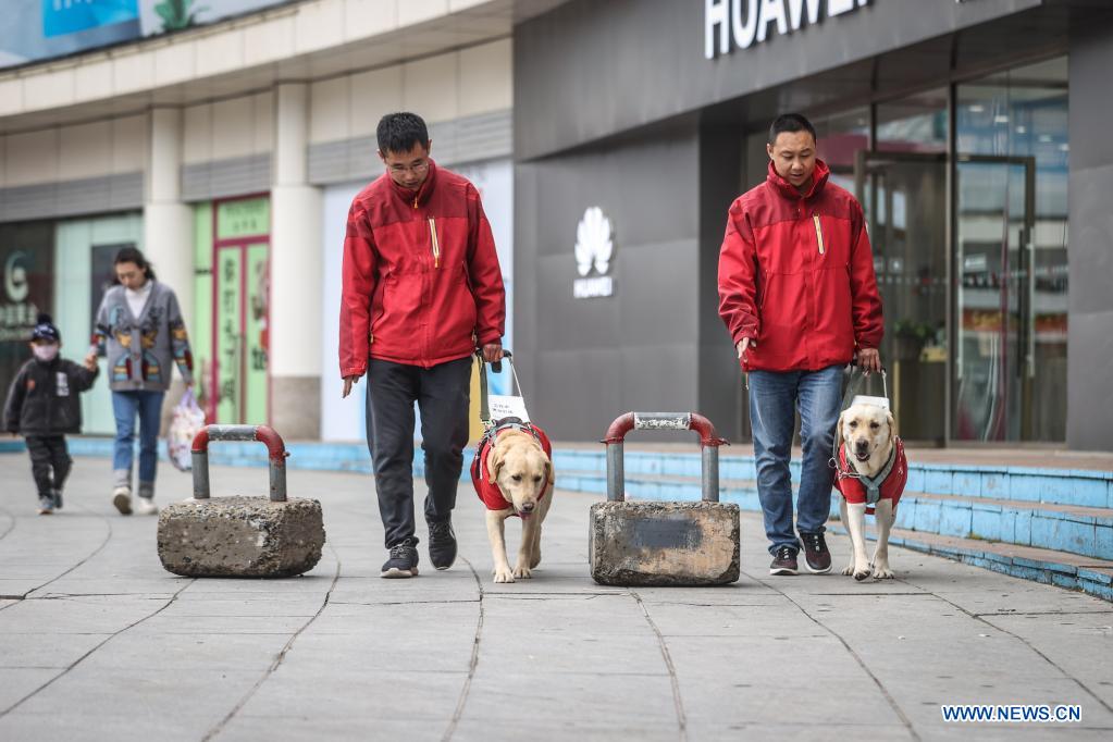 Trainers Fu Mingyan (R) and Jiang Boya train guide dogs on a street in Dalian, northeast China's Liaoning Province, April 23, 2021. The Dalian branch of the China Guide Dog Training Center, which was founded in May 2006, is a non-profit training institution of guide dogs in China. It has provided 239 free guide dogs to visually impaired people around the country. Guide dogs in the center are strictly selected from Labrador and Golden retrievers. Usually 45 days after birth, those puppies are sent to live with volunteer families, getting familiar with human life and learning simple orders. When the puppies grow up to about one year old, they are sent back to the center for professional training for one to one and a half year. Customized courses which are specially set according to the life scenes of visually impaired people, include going up and down stairs, avoiding obstacles and crossing streets. They also take a series of "exams", and the assessment of their characters is an important item. Those dogs that have a tendency to attack people will be dismissed. After completing all trainings, guide dogs will attend a 40-day joint training with visually impaired users. Every day, the users go out with guide dogs under the guidance of staff. Only when the two sides cooperate well and successfully pass the joint training period can the guide dog obtain a "graduation certificate" and be delivered to users. (Xinhua/Pan Yulong)