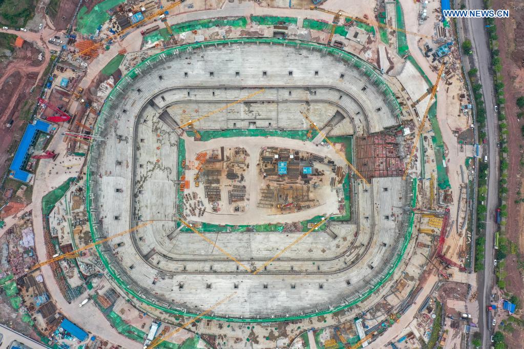 Aerial photo taken on April 28, 2021 shows the construction site of Chongqing Longxing football field in southwest China's Chongqing Municipality. Construction of the main structure of Chongqing Longxing football field was completed Wednesday. When completed, Longxing football field, as a venue of the 2023 AFC Asian Cup, will be able to accommodate 60,000 people to watch the game. (Xinhua/Huang Wei)