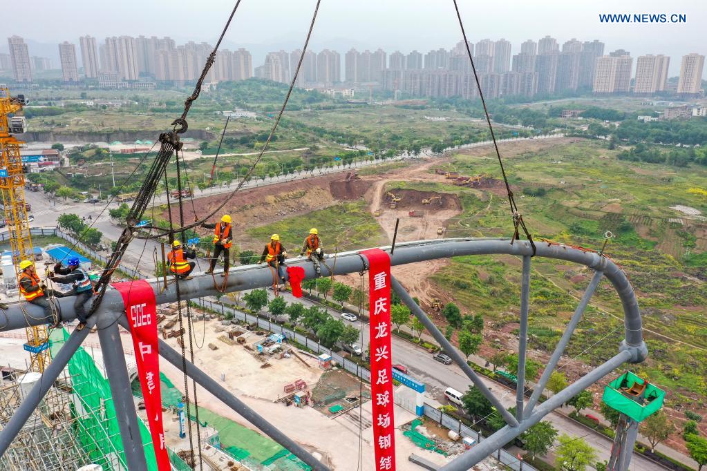 In this aerial photo taken on April 28, 2021, workers are busy at the construction site of Chongqing Longxing football field in southwest China's Chongqing Municipality, . Construction of the main structure of Chongqing Longxing football field was completed Wednesday. When completed, Longxing football field, as a venue of the 2023 AFC Asian Cup, will be able to accommodate 60,000 people to watch the game. (Xinhua/Huang Wei)