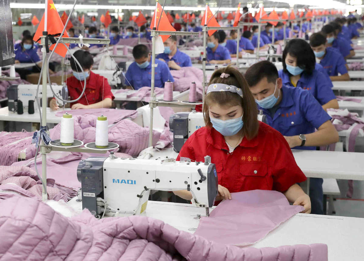 Workers make down-filled coats at a factory in Jiashi county, Xinjiang Uygur autonomous region. [Photo by Wang Zhuangfei/China Daily]