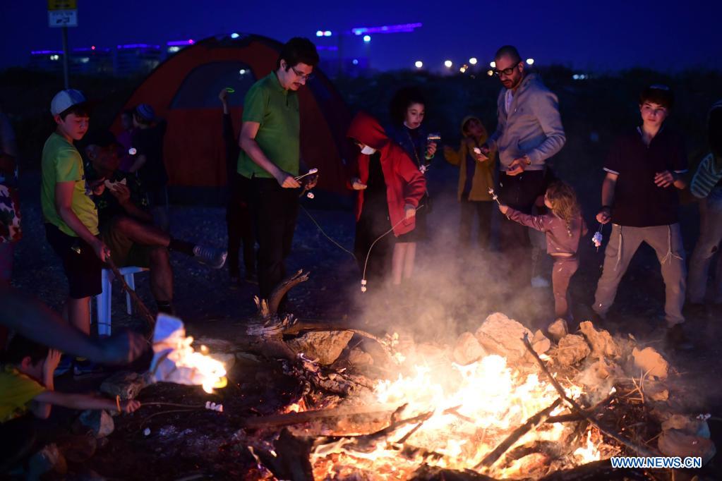 Israelis gather around a bonfire to celebrate Lag BaOmer in Tel Aviv, Israel, on April 29, 2021. Lag BaOmer, also known as Lag B'Omer, is a Jewish festival celebrated on the 33rd day of the Counting of the Omer, which occurs on the 18th day of the Hebrew month of Iyar. (Tomer Neuberg/JINI via Xinhua)
