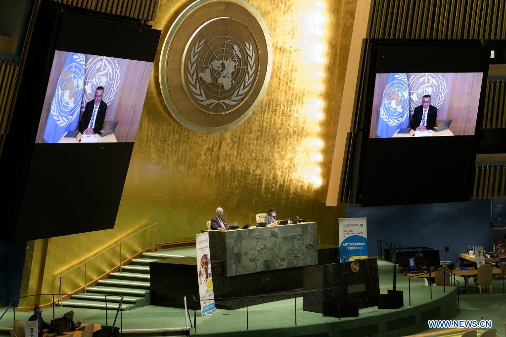 World Health Organization (WHO) Director-General Tedros Adhanom Ghebreyesus (on screens) addresses the General Assembly high-level interactive dialogue on antimicrobial resistance at the UN headquarters in New York, on April 29, 2021. UN General Assembly President Volkan Bozkir on Thursday called on member states to take action on antimicrobial resistance (AMR). (Manuel Elias/UN Photo/Handout via Xinhua)