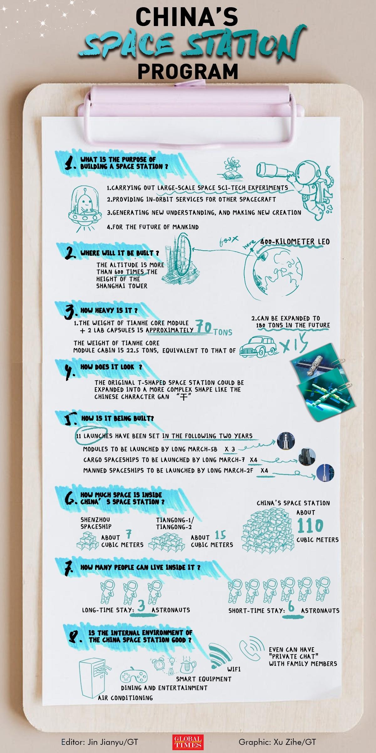 Once built, China's space station, slated to operate at a 400-kilometer low Earth orbit, will also mark the final phase of China's three-step manned space development.