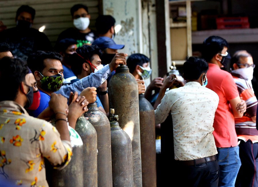 People wait in line to refill empty medical oxygen cylinders for COVID-19 patients in front of a shop in New Delhi, India, April 26, 2021. (Xinhua/Partha Sarkar)