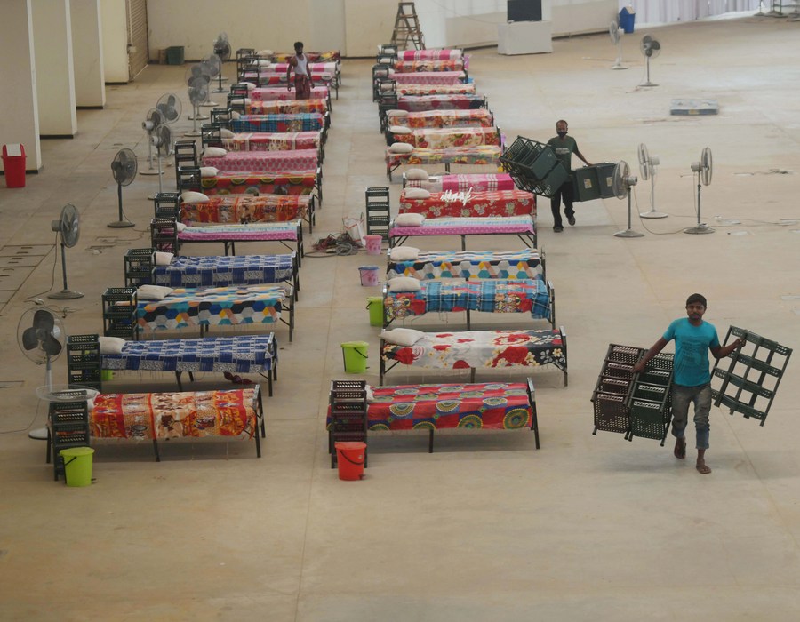 Workers arrange beds at a quarantine center on the outskirts of Agartala, India, April 30, 2021. (Str/Xinhua)