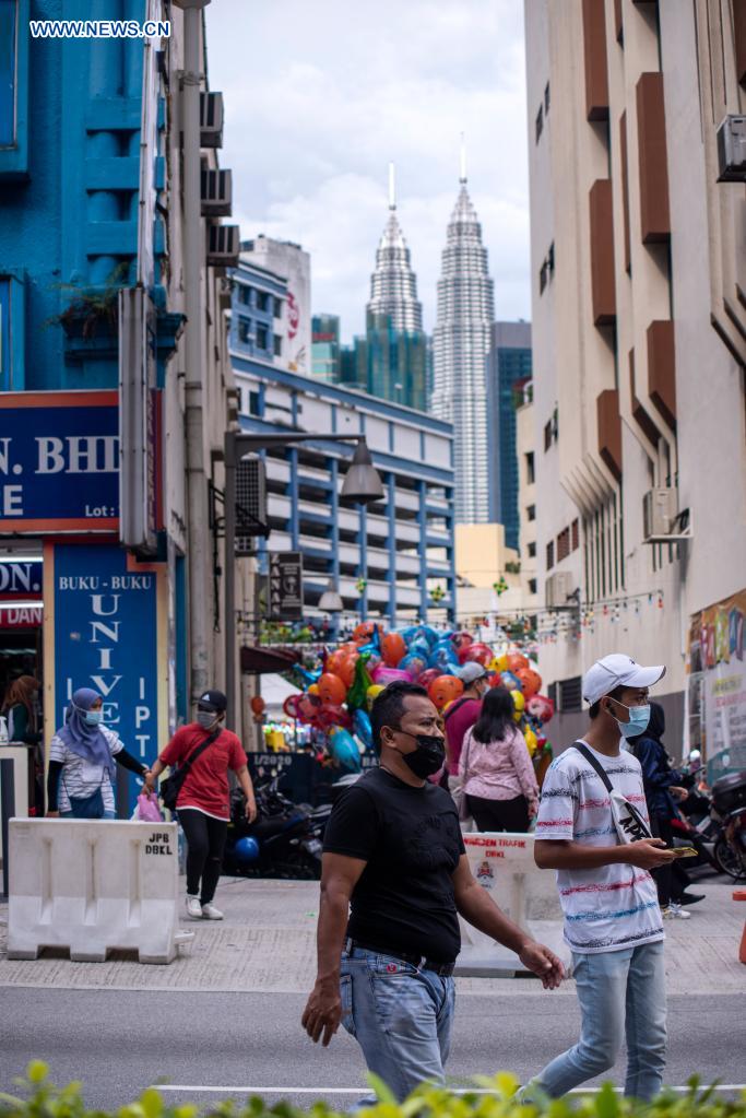 People wearing face masks walk on a street in Kuala Lumpur, Malaysia, May 2, 2021. Malaysia reported 3,418 new COVID-19 infections, the Health Ministry said on Sunday, bringing the national total to 415,012. (Photo by Chong Voon Chung/Xinhua)