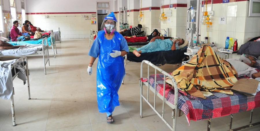 Patients receive treatment inside a COVID-19 ward in a hospital, in Bangalore, India, April 30, 2021. (Str/Xinhua)