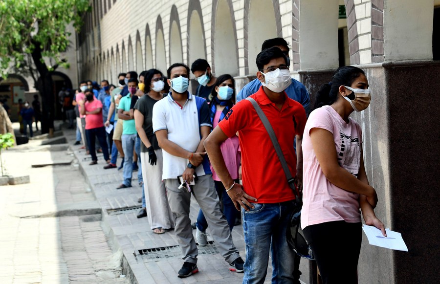 People wait to receive COVID-19 vaccination at a government school in Delhi, India, on May 3, 2021. (Xinhua/Partha Sarkar)