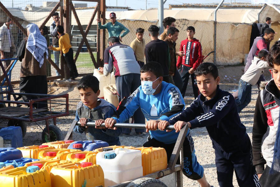 Children receive fuel distribution in Internal Displaced People (IDP) Hasansham U3 Camp in Nineveh province, Iraq, Dec. 8, 2020. (Xinhua)