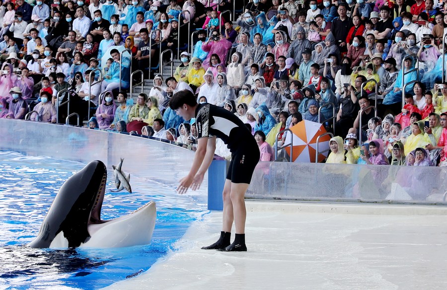 A breeder feeds a killer whale during a performance at Haichang Ocean Park in east China's Shanghai, May 1, 2021. (Xinhua/Fang Zhe)