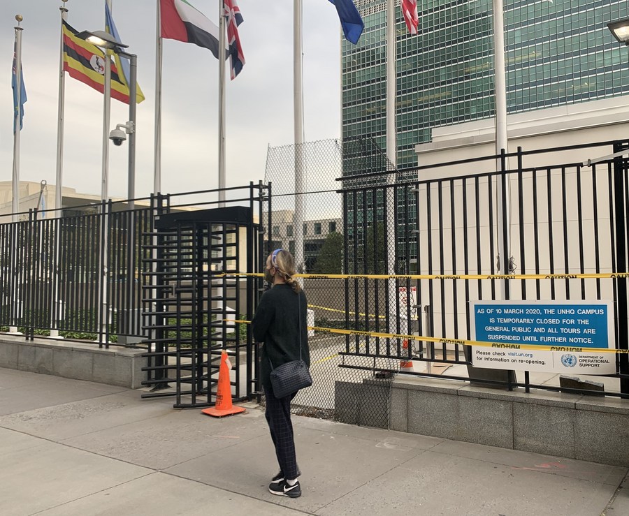 A woman walks by the staff entrance of the United Nations headquarters in New York, Oct. 27, 2020. (Xinhua/Wang Jiangang)