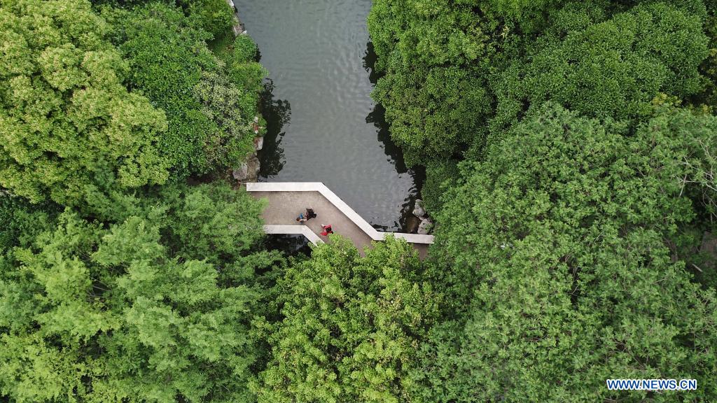 In this aerial photo, people stroll in Huancheng Park in Hefei, capital of east China's Anhui Province, May 5, 2021. (Xinhua/Zhang Duan)