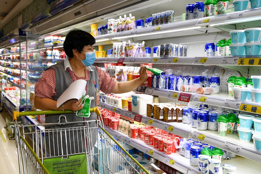 A staff member picks items according to customers' orders at a supermarket in Urumqi, northwest China's Xinjiang Uygur Autonomous Region, July 18, 2020. (Xinhua/Song Yanhua)