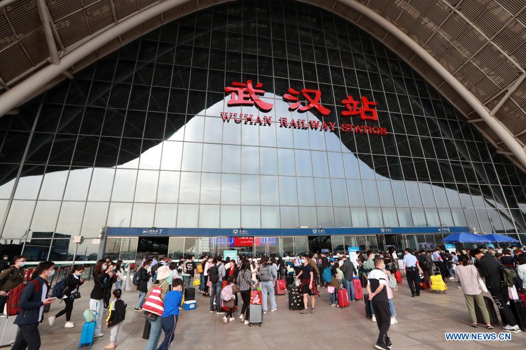 Passengers walk into Wuhan Railway Station in Wuhan, capital of central China's Hubei Province, May 5, 2021. During the five-day Labor Day holiday, about 4.03 million passenger trips were made via 117 railway stations administered by China Railway Wuhan Bureau Group Co., Ltd. (Photo by Zhao Jun/Xinhua)