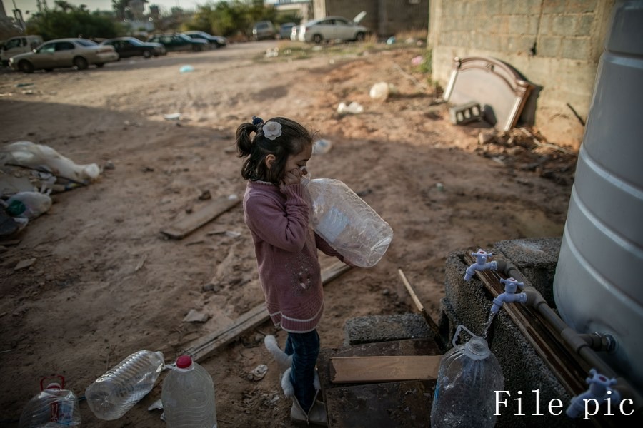 A displaced girl drinks water from a well in a building complex under construction, where hundreds of displaced families live, in Tripoli, Libya, March 2, 2020. (Xinhua/Amru Salahuddien)