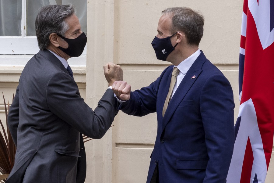 British Foreign Secretary Dominic Raab (R) meets with U.S. Secretary of State Antony Blinken ahead of the meeting of the Group of Seven (G7) foreign and development ministers in London, Britain, on May 3, 2021. (Tim Hammond/No 10 Downing Street/Handout via Xinhua)