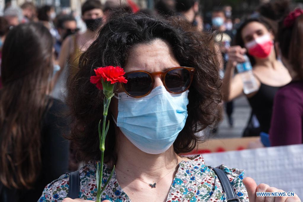A woman holding a flower is seen among demonstrators, in Athens, Greece, on May 6, 2021. Thousands of protesters hit the streets of Athens and other major cities on Thursday in rallies organized by labor unions to mark a belated May Day in Greece. (Xinhua/Marios Lolos)