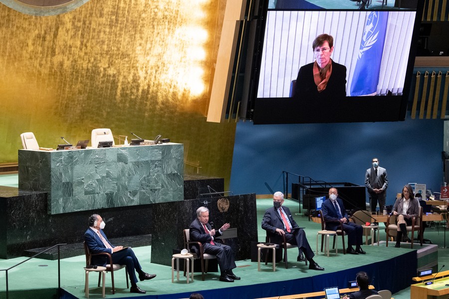 UN Secretary-General Antonio Guterres (2nd L) and China's permanent representative to the United Nations Zhang Jun (4th L) attend the UN General Assembly Interactive Dialogue to Commemorate and Promote the International Day of Multilateralism and Diplomacy for Peace at the UN headquarters in New York on May 5, 2021. (Eskinder Debebe/UN Photo/Handout via Xinhua)