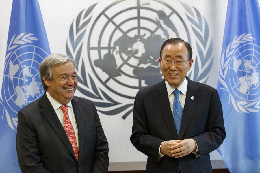 United Nations Secretary-General Ban Ki-moon (R) talks with UN Secretary-General-designate Antonio Guterres at the UN headquarters in New York, Oct. 13, 2016. The United Nations General Assembly on Thursday appointed by acclamation Portugal's former Prime Minister Antonio Guterres as next UN secretary-general to succeed retiring Ban Ki-moon on Jan. 1, 2017. (Xinhua/Li Muzi)