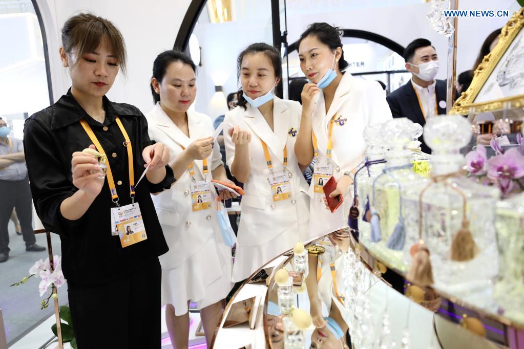 A visitor tries perfume in the Fashion Life Exhibition Hall of the first China International Consumer Products Expo in Haikou, capital of south China's Hainan Province, May 7, 2021. Slated for May 7-10, the first China International Consumer Products Expo has attracted 648 overseas companies and 1,365 brands from 69 countries and regions, as well as 857 enterprises and 1,263 brands from China. Covering 80,000 square meters, the expo will be the largest consumer goods expo in the Asia-Pacific region, the organizers said. (Xinhua/Jin Liwang)