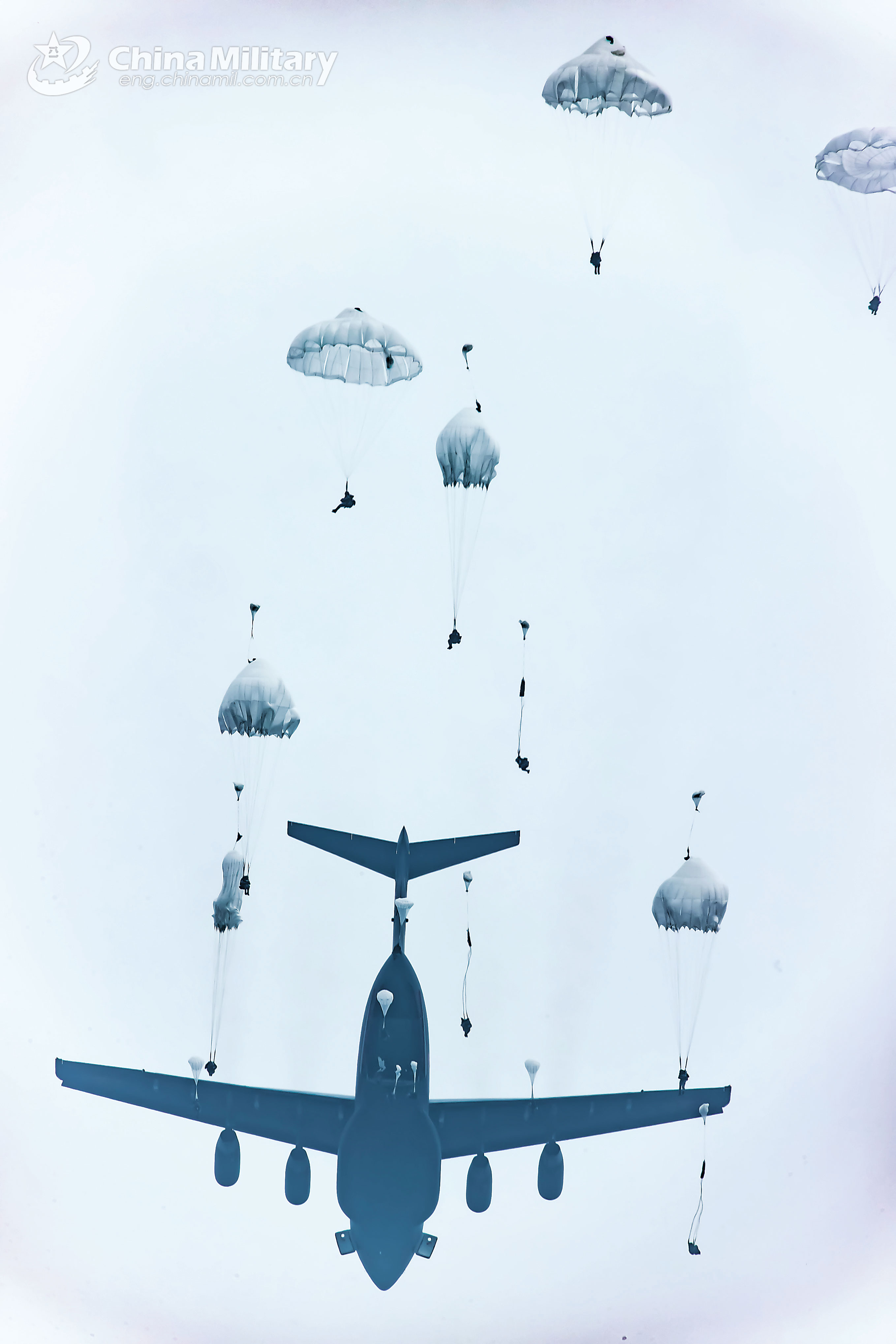 Paratroopers assigned to an airborne brigade under the PLA Air Force jump from the storehouse of a transport aircraft during a round-the-clock fully-formed force projection drill in mid-April, 2021. (eng.chinamil.com.cn/Photo by Shen Ling, Li Xuyang and Wu Yongfei)