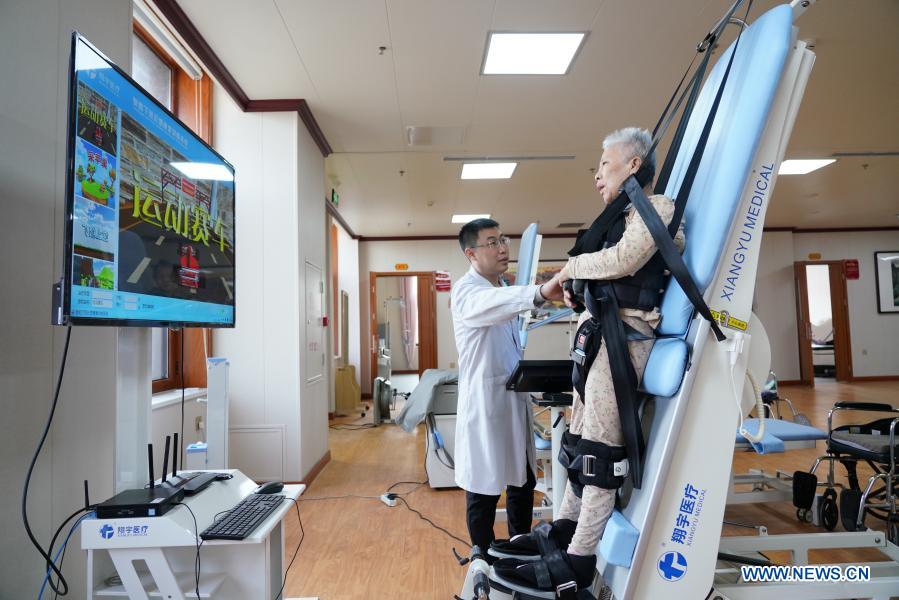 An elderly man undertakes rehabilitation training at the Tangshan Anxin Medical Pension Manor in Guye District of Tangshan City in north China's Hebei Province, March 24, 2021. (Xinhua/Mu Yu)