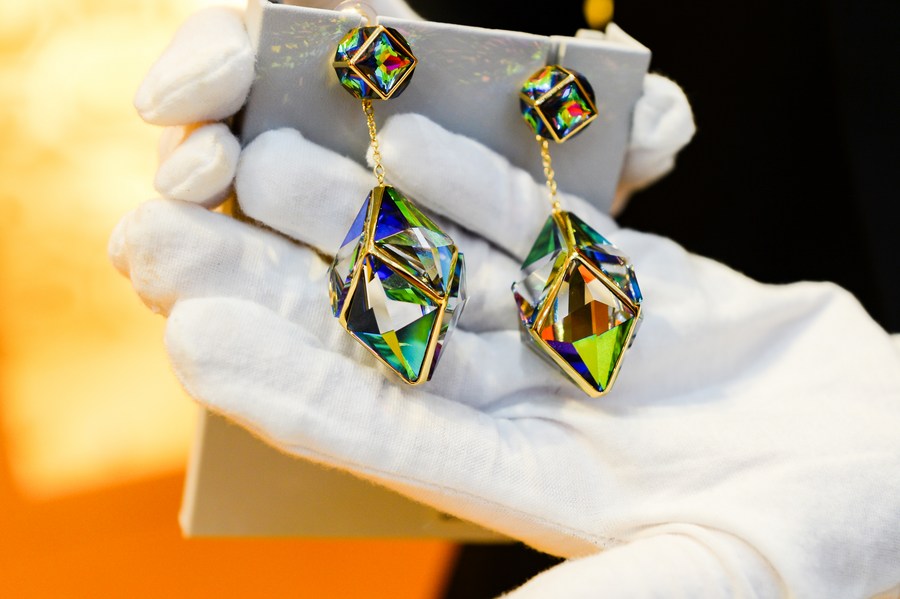 Photo taken on May 7, 2021 shows a pair of earrings displayed at the first China International Consumer Products Expo in Haikou, capital of south China's Hainan Province. (Xinhua/Zhou Jiayi)