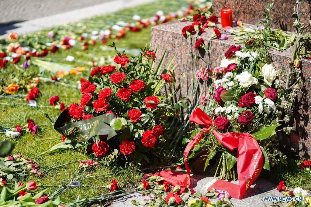 Flowers and bouquets are seen at the Soviet Memorial in Treptower Park following a gathering to mark the 76th anniversary of the end of World War II in Europe, known as Victory in Europe Day, in Berlin, capital of Germany, May 9, 2021. (Photo by Stefan Zeitz/Xinhua)