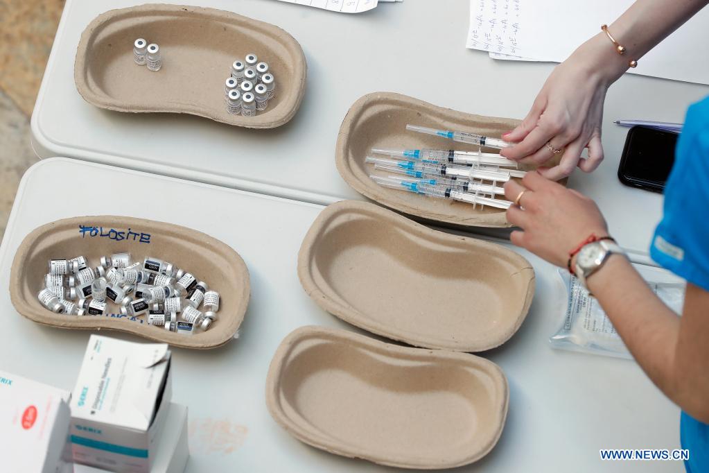 Medical personnel prepare to conduct COVID-19 vaccination for locals during Romania's "vaccination marathon" at the National Library during COVID-19 pandemic in Bucharest, Romania, May 9, 2021. Romania's largest "vaccination marathon," aimed at further boosting COVID-19 jab rollout in the country, kicked off here on May 7. (Photo by Cristian Cristel/Xinhua)