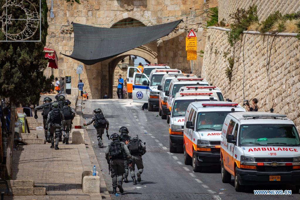 Israeli police patrol around the Al-Aqsa Mosque compound in Jerusalem on May 10, 2021. Israeli police and Palestinian worshipers clashed inside a flashpoint at a Jerusalem holy site on Monday morning, leaving at least dozens of Palestinians injured, according to the Palestinian Red Crescent. Israeli Police said in a statement that "thousands of Palestinians rioted" and hurled stones and other objects from the Al-Aqsa Mosque compound at police officers. (JINI via Xinhua)