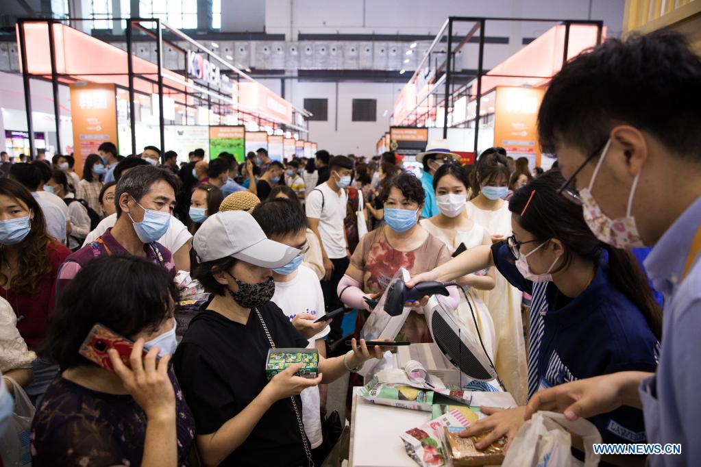 People select goods at the first China International Consumer Products Expo in Haikou, capital of south China's Hainan Province, May 10, 2021. The expo greeted its public day on Monday. (Xinhua/Jin Liwang)