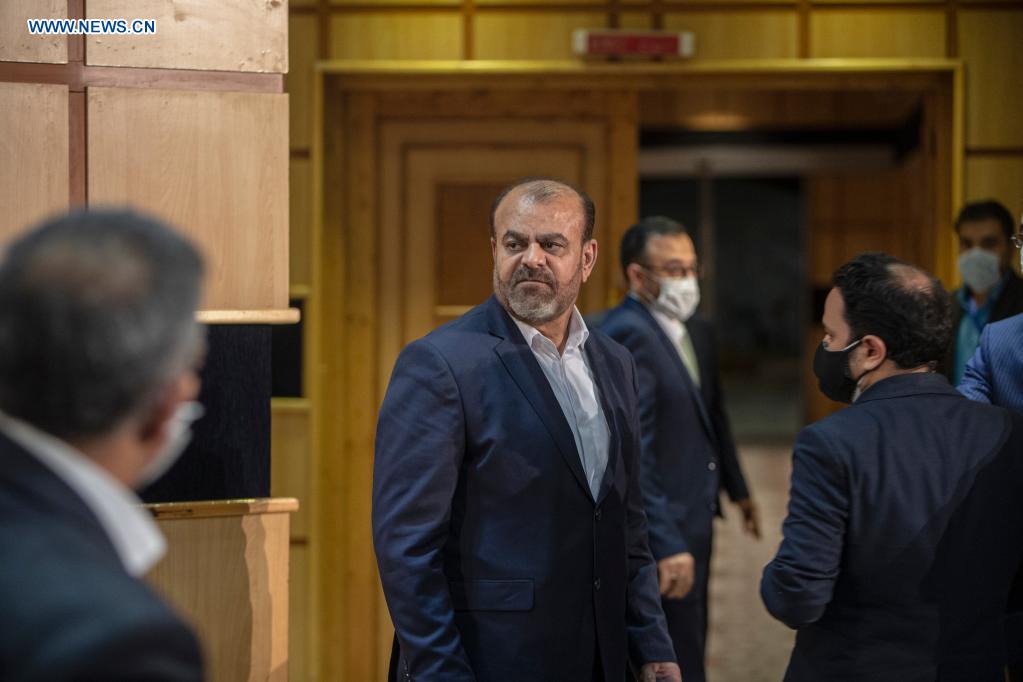 Former Iranian Oil Minister Rostam Ghasemi (C) leaves after he registered his candidacy for presidential race at the Interior Ministry in Tehran, Iran, May 12, 2021. Iran's Interior Ministry on Tuesday officially started registering candidates for the 13th presidential election, state TV reported. (Photo by Ahmad Halabisaz/Xinhua)
