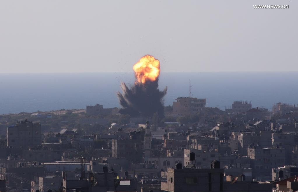 Photo taken on May 13, 2021 shows explosions following Israeli airstrikes in the southern Gaza Strip city of Rafah. Thursday was another day of intense fighting between Israel and Hamas, as more than 1,700 missiles have been fired from the Gaza Strip into Israel in the last three days while the Israeli military has conducted hundreds of airstrikes in Gaza. (Photo by Khaled Omar/Xinhua)