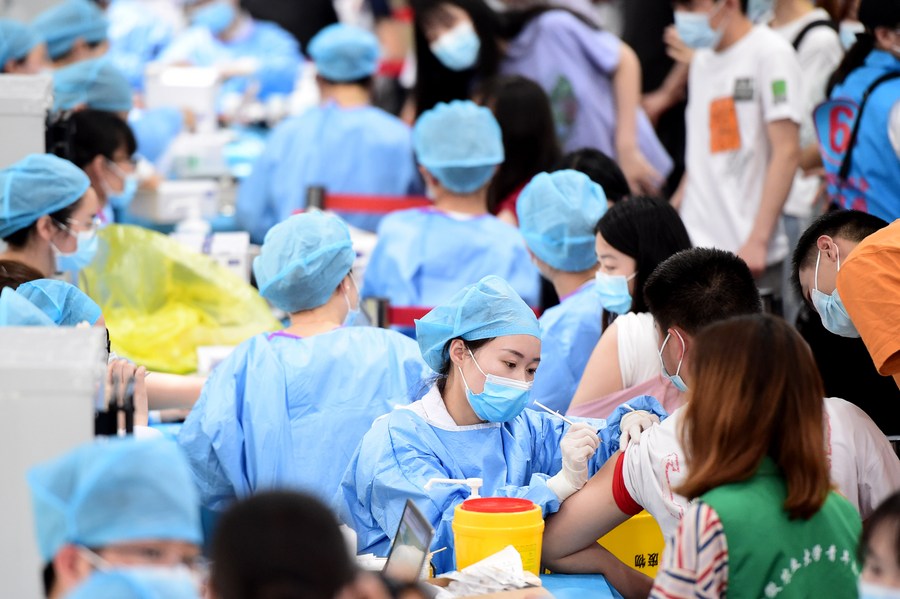 Faculty members and students receive COVID-19 vaccines at a vaccination site at Anhui Agricultural University in Hefei, east China's Anhui Province, May 13, 2021. (Xinhua/Huang Bohan)