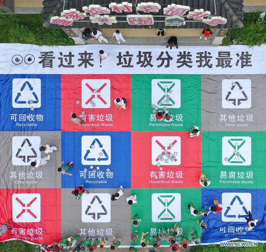 Aerial photo shows villagers playing a garbage sorting game in Shengjiawu Village, Wuxing District of Huzhou, east China's Zhejiang Province, July 28, 2020. The government of Huzhou has been exploring rural-specific garbage sorting mechanisms in recent years. (Xinhua/Weng Xinyang)