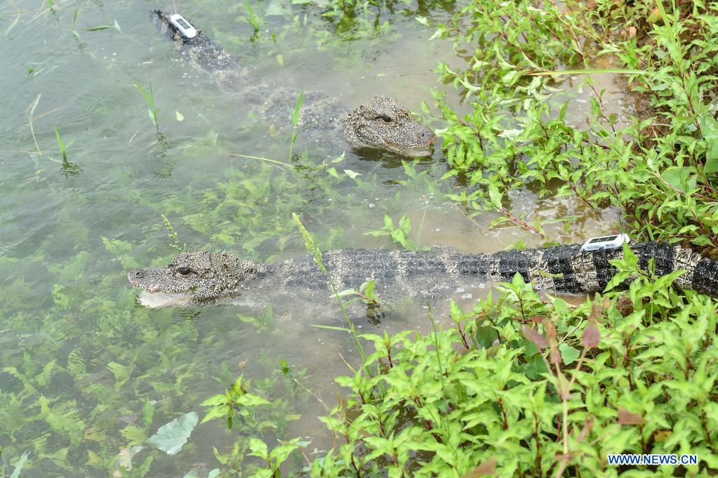 Photo taken on May 13, 2021 shows Yangtze alligators at a release point of the Anhui Chinese alligator national nature reserve in Jingxian County, east China's Anhui Province. The nature reserve on Thursday released 51 artificially bred Yangtze alligators, also known as Chinese alligators, into the wild, with another 479 planned to be set free at different release points in the reserve. The nature reserve has begun reintroducing the endangered reptiles into the wild since 2003, and as of 2020, a total of 508 Chinese alligators have been released in 16 batches. (Xinhua/Han Xu)